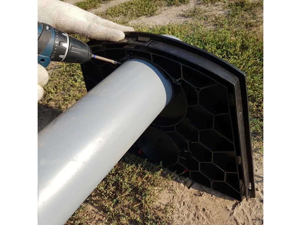11 do vyvrtaného otvoru instalujte větrací komínek (inspekční otvor) a pomocí nerezových vrutů jej přichyťte k tunelu