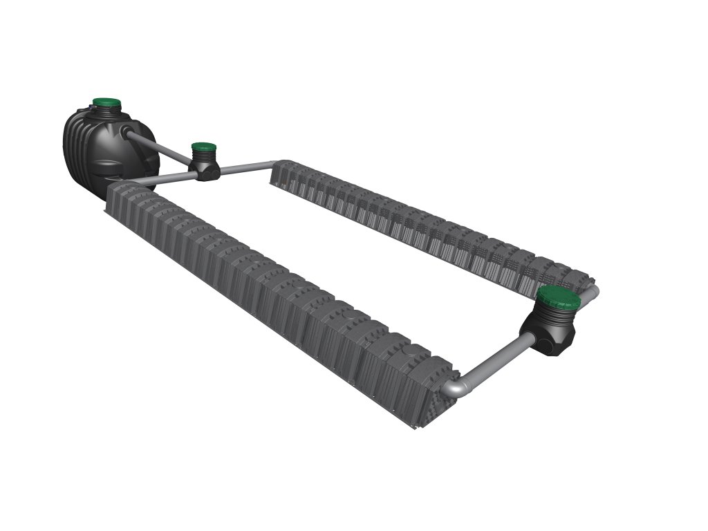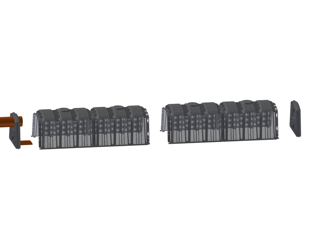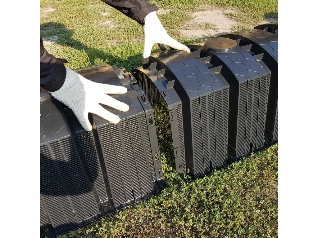 Minimální šířka výkopu lože by měla být 0,5 m a minimální vzdálenost mezi sousedícími řadami tunelů by měla být min. 1 m. Dno výkopu by mělo být pečlivě vyrovnáno. Na dně výkopu by měla být štěrkové podloží podporující vsakování (1) skládající se z kamenů frakce 16-32 mm nebo kameniva (bez vápence) s frakcí 32-64 mm, o tloušťce ne menší než 100 mm. Za předpokladu, že jsou půdy dobře propustné. Nosnou vrstvu lze libovolně zvyšovat v závislosti na půdních a vodních podmínkách. Tunely by měly být pokryty geotextilií (2). Tunelové vedení by mělo být položeno se sklonem asi 1 %. Tunely by měly být položeny v maximální hloubce 1200 mm, od povrchu terénu k horní hraně tunelu. Délka jedné řady tunelů by neměla přesáhnout 30 m. Každá řada tunelů by měla být vybavena přívodem vzduchu - spodní ventilace. Tunelové řady se na konci instalace zasypou nativní zeminou (3). Pro odvod dešťové vody není nutná nosná vrstva.