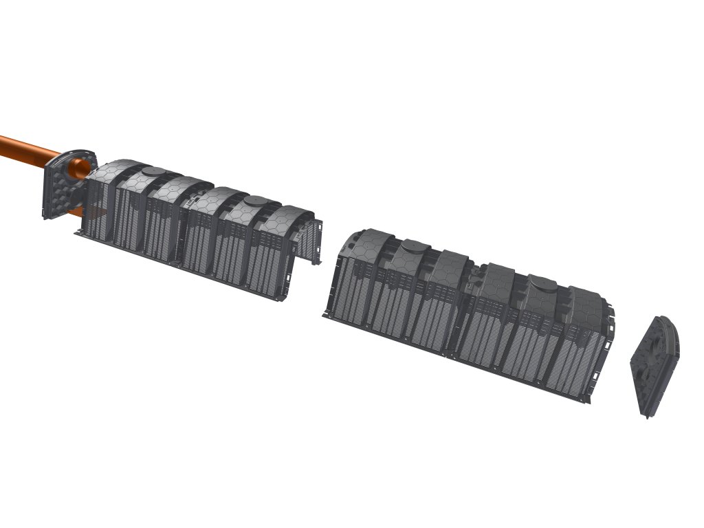 Na začátku tunelové řady je namontována koncová deska vybavená deflektorem. Deflektor absorbuje hydraulický ráz dopravované odpadní nebo dešťové vody. Díky jeho použití nedochází k vyplavování zeminy v místě přítoku odpadní nebo dešťové vody. Koncovou desku instalujeme také na konec tunelové linky. Instalace by měla být vybavena větracím přívodem vzduchu. To stejné lze aplikovat pomocí jednoho ze dvou připojení umístěných na horní stěně každého tunelu nebo pomocí horního připojení v uzavírací koncové desce. Spoje v horní části tunelu lze také použít jako inspekční otvory.
