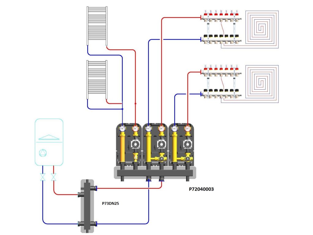 - jako hydraulický separátor s izolací pro podlahové/sálavé vytápění a vysokoteplotní systémy