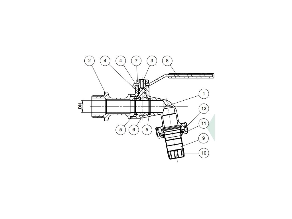 1 tělo CW617N Ni, 2 koncové připojení CW617N Ni, 3 dřík CW614N, 4 o-ring NBR, těsnění koule PTFE, 6 koule CW617N, 7 matice pozinkovaná ocel, 8 páka ocel, 9 hadičník CW617N Ni, 10 směrovač proudu PP kopolymer, 11 ZAMA,  12 těsnění NBR70