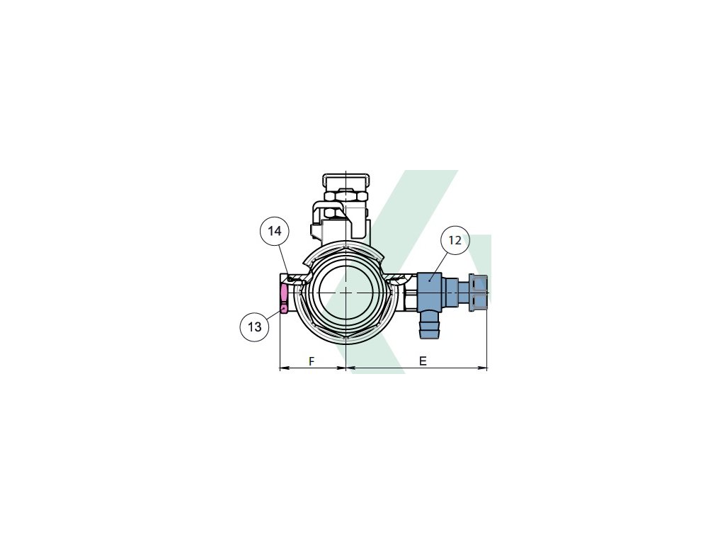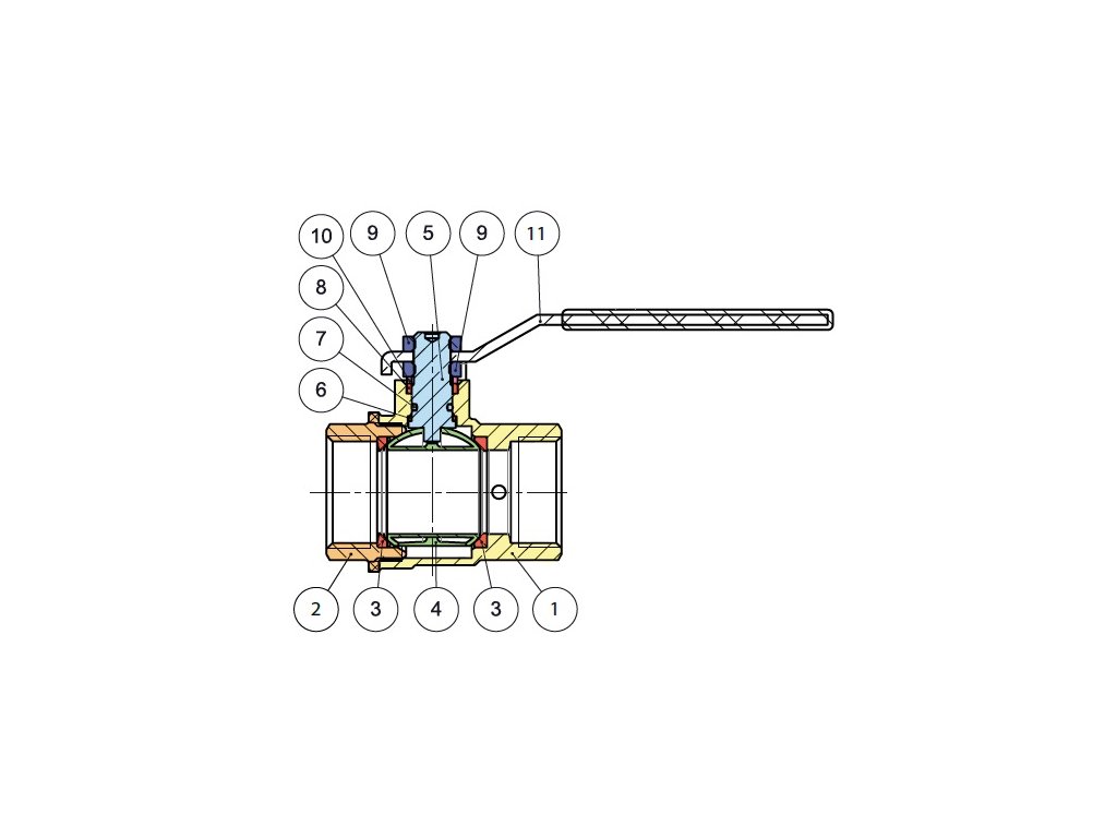 1 tělo CW617N Ni, 2 koncové připojení CW617N Ni, 3 těsnění koule PTFE G400 Green, 4 koule CW617N Ni+Cr, dřík CW614N, 6 spodní těsnění PTFE G400, 7 o-kroužek 01/T70 FKM VITON, 8 horní těsnění PTFE G400 Green, 9 matice ocel Zn, 10 mosazný kroužek CW614N, 11 ručka ocel s potiskem, 12 vypouštěcí kohout CW614N+POM, 13 zátka CW614N, 14 o-kroužek 01/T70 FKM VITON