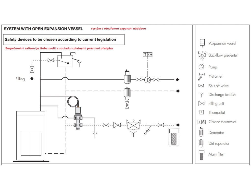 Aby se předešlo jakékoli poruše v důsledku přítomnosti nečistot, doporučuje se nainstalovat na plnicí vstup kontrolovatelné y-filtr nebo jiný filtr s magnetem. Vše je nutné pravidelně kontrolovat, zda je sítko filtru čisté a neucpané. Doporučuje se instalovat sítko v průhledné nádobě, aby bylo možné kontrolovat stav nečistot během provozu.