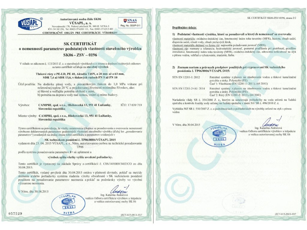 Na trhu ve vodárenském segmentu působí CAMPRI, spol. s r.o., Slovensko 31 let. Za tu dobu se vyprofilovali a zařadili mezi nejúspěšnější společnosti v tomto odvětví. Společnost zajišťuje kompletní dodávky pro vodohospodářské stavby, jako potrubí a tvarovky (PE, PVC, PP, litina, sklolaminát, kamenina), vodárenské armatury, betonový program a jiné příslušenství pro vodovodní a kanalizační systémy, úpravny vod, vodojemy a čistírny odpadních vod. Vlastní výroba sestává HDPE a LDPE polyethylenových vodovodních potrubí. Široký sortiment od DN 16 do DN 400 je určen především pro rozvody pitné vody. Výrobky lze použít také pro jiné aplikace, jako závlahy, chráničky kabelů, tlaková kanalizace a podobně. Každá aplikace je charakterizována příslušným barevným pruhem na potrubí. Výrobky jsou se zkouší ve vlastní laboratoři podle evropských norem. Certifikaci potrubí provádějí akreditované certifikační orgány v ČR a SR.