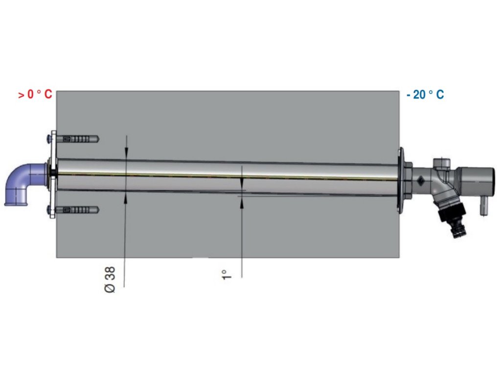 - průměr vrtaného otvoru 38 mm (otvor musí být proveden pod úhlem 1° se sklonem od vnitřní stěny ven)