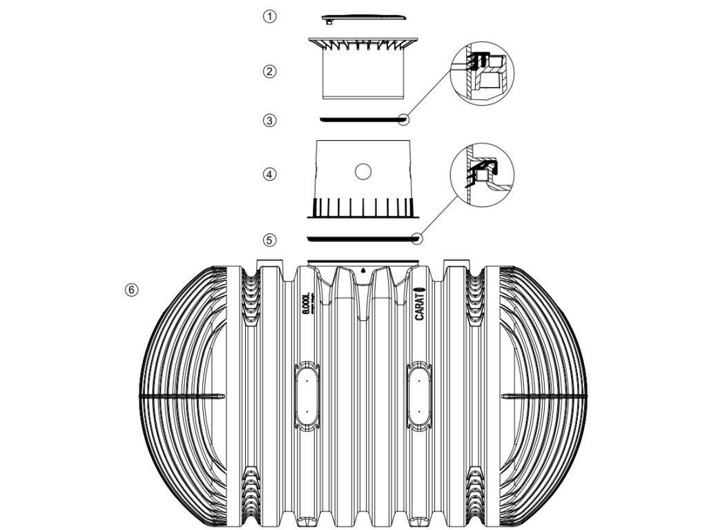 Je-li nádrž instalována pod pojezdovými plochami, pojížděnými nákladním vozy do 12 t, musí být teleskopický nástavec 1 (barva antracit) v oblasti límce podbetonována 4 (třída zatížení B25 = 250 Kg/m²). Následně se instalují betonové kruhy (Ø 600 mm) a litinový rám 5 s hvězdicovitým rozložením zatížení pro zabudování litinového víka (zohlednit min. 800 mm, max. 2000 mm půdního překryvu). Litinový rám musí mít styčnou plochu cca 1 m².