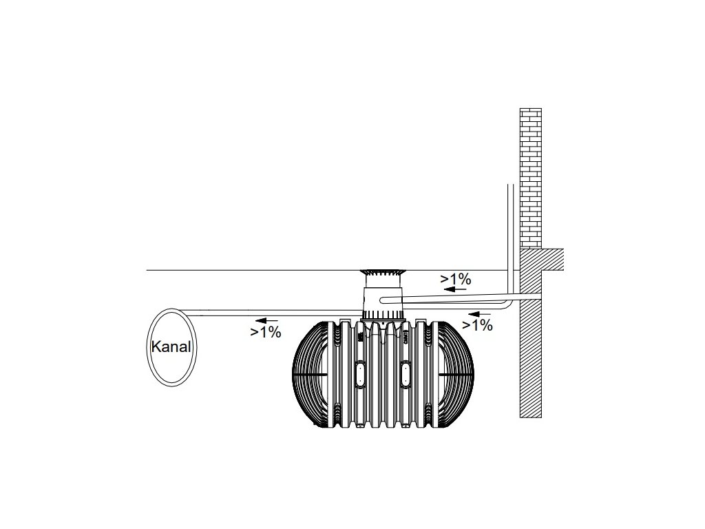 Veškeré přívodní a přepadové potrubí je nutno položit se sklonem min. 1 % ve směru toku do nádrže (přitom je nutno zohlednit možné pozdější poklesy). Bude-li přepad nádrže napojen na veřejnou kanalizaci, musí být zajištěn proti zpětnému vzdutí zpětnou klapou (pouze kanál na dešťovou vodu). Veškerá sací, tlaková a řídící potrubí je třeba vést v prázdné trubce (chránička), která se pokládá se sklonem k nádrži bez průhybů co možná nejrovněji. Požadované oblouky je možno vytvořit 30° tvarovkami.