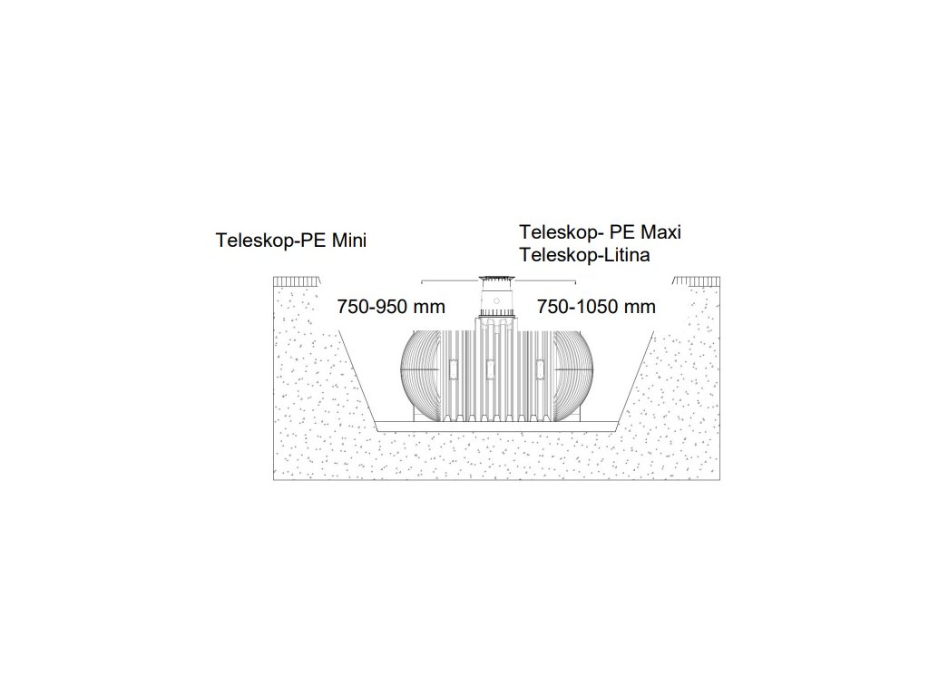 Teleskopický nástavec umožní plynulé nastavení poklopu nádrže do požadované roviny s okolním terénem mezi 750 mm a 950 mm (teleskop MINI) resp. 750 mm a 1050 mm (teleskop MAXI). Při montáži se profilované těsnění nádrže (materiál EPDM) dostatečně natře mazadlem (nepoužívat žádná maziva na bázi minerálních olejů, které těsnění naleptávají). Následně se namaže rovněž teleskopická šachta, nasadí se na nádrž a vyrovná s okolním povrchem povrchem.