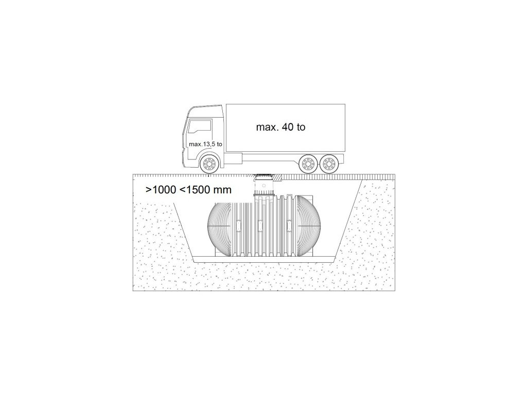 Výška překryvu nádrže teleskopickým nástavcem a litinovým poklopem BEGU (třída B, resp. D) v pojezdové oblasti nákladními vozidly do 40 t. Je třeba zhotovit betonovou roznášecí desku. Výpočet musí být proveden statikem! (oblast bez spodní vody).