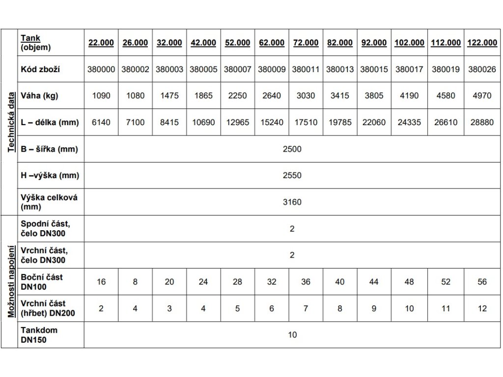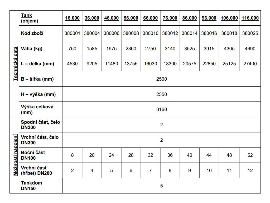 | Objem: | 16000 l, 22000 l, 26000 l, 32000 l, 36000 l, 42000 l, 46000 l, 52000 l, 56000 l, 62000 l, 66000 l, 72000 l, 76000 l, 82000 l, 86000 l, 92000 l, 96000 l, 102000 l, 106000 l, 112000 l, 116000 l, 122000 l |
