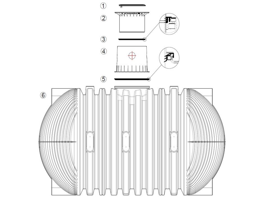 Je-li nádrž instalována pod pojezdovými plochami, pojížděnými nákladním vozy do 12 t, musí být teleskopický nástavec 1 (barva antracit) v oblasti límce podbetonována 4 (třída zatížení B25 = 250 Kg/m²). Následně se instalují betonové kruhy (Ø 600 mm) a litinový rám 5 s hvězdicovitým rozložením zatížení pro zabudování litinového víka (zohlednit min. 800 mm, max. 2000 mm půdního překryvu). Litinový rám musí mít styčnou plochu cca 1 m².