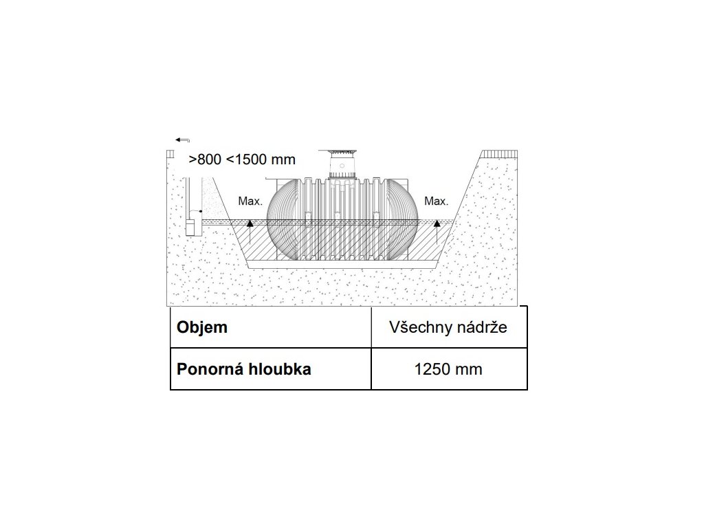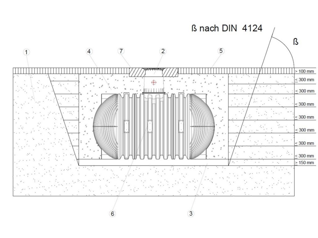 Pro zajištění maximálního pracovního prostoru musí základní plocha stavební jámy přesahovat na každé straně o 500 mm, odstup od pevných staveb musí být nejméně 1000 mm. Svah je nutno založit dle DIN 4124. Pozemek musí být vodorovný, plochý a musí vykazovat dostatečnou nosnost. Hloubka jámy musí být vyměřena tak, aby nebyl překročen maximální překryv nad nádrží (viz bod Podmínky pro instalaci). Pro celoroční používání zařízení je třeba instalovat nádrž a vodovodní části zařízení v nezámrzné hloubce. Nezámrzná hloubka je zpravidla v hloubce cca 600 mm – 800 mm, přesné údaje obdržíte u příslušného úřadu. Jako podklad se pokládá vrstva zhuštěného kulatozrnného štěrku (zrnitost 8/16, tloušťka vrstvy cca 150 – 200 mm).