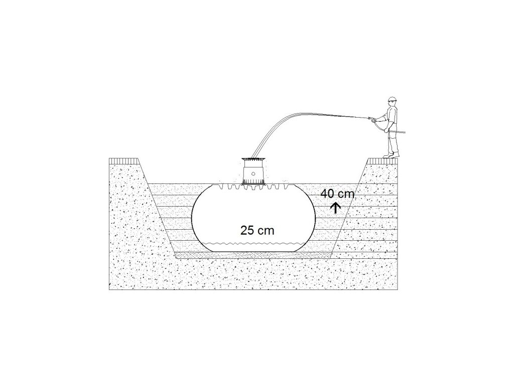 Pro zamezení případných deformací se nádrž před samotným obsypáním pláště naplní z 1/3 vodou, poté se ve vrstvách v max. 40 cm krocích obsype nádrž (kulatozrnný štěrk 8/16) až k hornímu okraji nádrže a vše se utěsní.