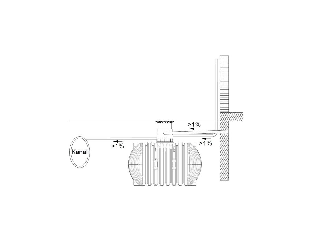 Veškeré přívodní a přepadové potrubí je nutno položit se sklonem min. 1 % ve směru toku do nádrže (přitom je nutno zohlednit možné pozdější poklesy). Bude-li přepad nádrže napojen na veřejnou kanalizaci, musí být zajištěn proti zpětnému vzdutí zpětnou klapou (pouze kanál na dešťovou vodu). Veškerá sací, tlaková a řídící potrubí je třeba vést v prázdné trubce (chránička), která se pokládá se sklonem k nádrži bez průhybů co možná nejrovněji. Požadované oblouky je možno vytvořit 30° tvarovkami.