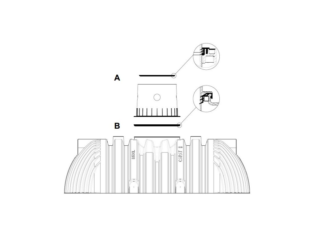 Před vlastní montáží se dodané těsnění vloží mezi nádrž a dóm do těsnící drážky hrdla nádrže „B“, potom se dóm vyrovná s přívodním potrubím a zatlačí do hrdla nádrže až na doraz. Je nutné věnovat pozornost hornímu těsnění „A“ (je již předmontované).
