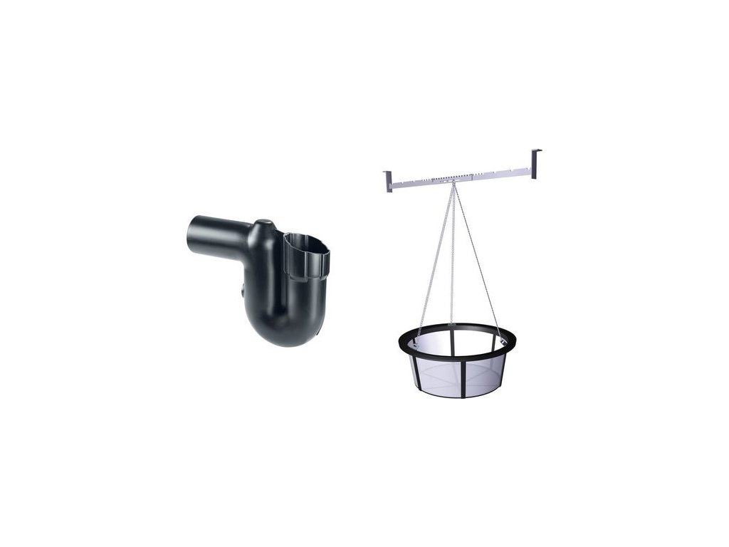 Současně dodaná rozpěra z nerezové oceli 1 se postaví na odpovídající průměr teleskopické dómové šachty (min. 570 mm / max. 690 mm) a potom se postaví na hrdlo šachty. Potom se připravený filtr 3 zavede ze shora přes dómovou nádrž, na které je natlačená přítoková roura, která vyčnívá min. 100 mm a s jejíž pomocí se napřed zaháknou do rozpěry již přizpůsobené řetězy 2. Dbejte na to, že se filtrační koš musí nacházet nad maximálním stavem vody. Zabrání se tím znečištění vody v nádrži zadrženými nečistotami ve filtračním koši.