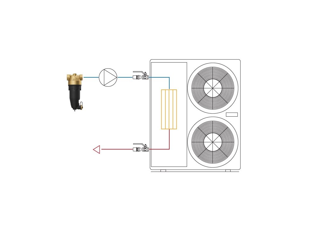 Doporučuje se nainstalovat DirtOUT® HP na vratný okruh na vstupu tepelného čerpadla, aby byl chráněn před všemi nečistotami přítomnými v systému, zejména ve fázi spouštění.