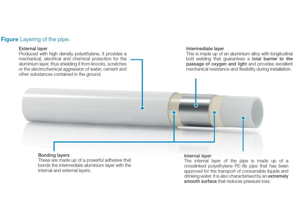 Kombinace síťovaného polyethylenu, hliníku a vysokohustotního polyethylenu zaručuje vynikající flexibilitu během fáze ohýbání (i ruční ohýbání).